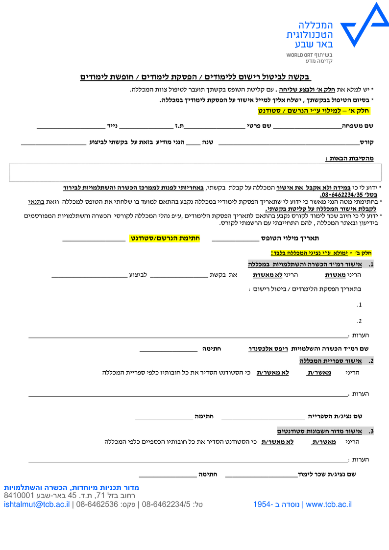 אישור מדור חשבונות סטודנטים: הריני מאשר כי הסטודנט הסדיר את כל חובותיו הכספיים כלפי המכללה (שדה חובה)