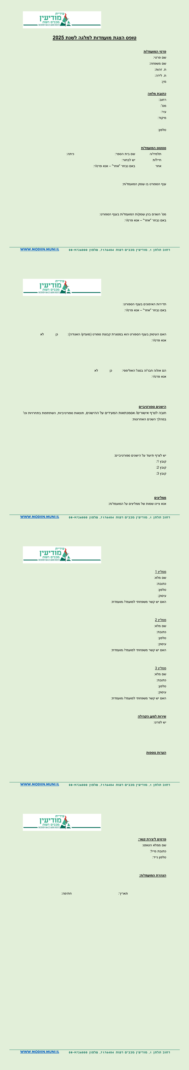 <p style="text-align: center;"><b><span lang="HE" dir="RTL" style="font-size:13.0pt"><span style="font-family:Aharoni"><span style="color:#026e59"><span style="letter-spacing:.7pt">רחוב תלתן 1, מודיעין מכבים רעות 7176404, טלפון 08-9726000</span></span></span></span></b><br></p><p style="text-align: center;"><b></b><span dir="RTL" style="font-size:12.0pt"><span style="font-family:"Times New Roman",serif"><a data-cke-saved-href="http://www.modiin.muni.il/" href="http://www.modiin.muni.il/" title="קישור לאתר האינטרנט של עיריית מודיעין מכבים רעות" style="color:#0563c1; text-decoration:underline"><span dir="LTR" style="font-size:11.0pt"><span style="font-family:Aharoni">WWW.MODIIN.MUNI.IL</span></span></a></span></span><b></b><br></p>
