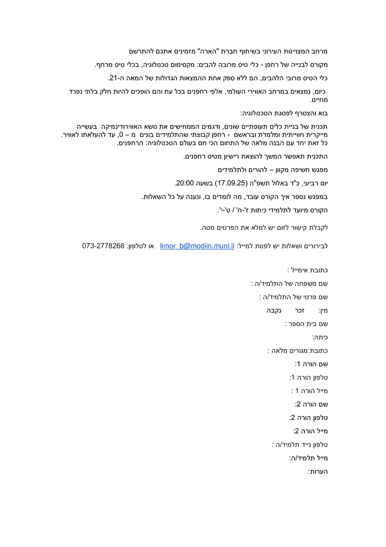 <p dir="RTL" style="text-align:right"><span style="font-size:12pt"><span style="background:white"><span style="direction:rtl"><span style="unicode-bidi:embed"><span style="font-family:"Times New Roman",serif"><span lang="HE" style="font-size:11.0pt"><span style="font-family:"Arial",sans-serif"><span style="color:#202124"></span></span></span></span></span></span></span></span></p><p dir="RTL" style="text-align:right; margin-bottom:11px"><span style="font-size:11pt"><span style="line-height:115%"><span style="direction:rtl"><span style="unicode-bidi:embed"><span style="font-family:Calibri,sans-serif"><span lang="HE" style="background:white"><span style="font-family:"Helvetica",sans-serif"></span></span></span></span></span></span></span></p><p dir="RTL" style="text-align:right; margin-bottom:11px"><span style="font-size:11pt"><span style="line-height:normal"><span style="direction:rtl"><span style="unicode-bidi:embed"><span style="font-family:Calibri,sans-serif"><span lang="HE" style="background:white"><span style="font-family:"Helvetica",sans-serif"></span></span></span></span></span></span></span></p><p dir="RTL" style="text-align:right; margin-bottom:11px"><span style="font-size:11pt"><span style="line-height:normal"><span style="direction:rtl"><span style="unicode-bidi:embed"><span style="font-family:Calibri,sans-serif"><span lang="HE" style="background:white"><span style="font-family:"Helvetica",sans-serif">מרחב המצויינות העירוני בשיתוף חברת "הארה" מזמינים אתכם להתרשם</span></span></span></span></span></span></span></p><p dir="RTL" style="text-align:right; margin-bottom:11px"><span style="font-size:11pt"><span style="line-height:normal"><span style="direction:rtl"><span style="unicode-bidi:embed"><span style="font-family:Calibri,sans-serif"><span lang="HE" style="background:white"><span style="font-family:"Helvetica",sans-serif">מקורס לבנייה של רחפן - כלי טיס מרובה להבים: מקסימום טכנולוגיה, בכלי טיס מרחף. </span></span></span></span></span></span></span></p><p dir="RTL" style="text-align:right; margin-bottom:11px"><span style="font-size:11pt"><span style="line-height:normal"><span style="direction:rtl"><span style="unicode-bidi:embed"><span style="font-family:Calibri,sans-serif"><span lang="HE" style="background:white"><span style="font-family:"Helvetica",sans-serif">כלי הטיס מרובי הלהבים, הם ללא ספק אחת ההמצאות הגדולות של המאה ה-21. </span></span></span></span></span></span></span></p><p dir="RTL" style="text-align:right; margin-bottom:11px"><span style="font-size:11pt"><span style="line-height:normal"><span style="direction:rtl"><span style="unicode-bidi:embed"><span style="font-family:Calibri,sans-serif"><span lang="HE" style="background:white"><span style="font-family:"Helvetica",sans-serif"> כיום, נמצאים במרחב האווירי העולמי, אלפי רחפנים בכל עת והם הופכים להיות חלק בלתי נפרד מחיינו. </span></span></span></span></span></span></span></p><p dir="RTL" style="text-align:right; margin-bottom:11px"><span style="font-size:11pt"><span style="line-height:normal"><span style="direction:rtl"><span style="unicode-bidi:embed"><span style="font-family:Calibri,sans-serif"><span lang="HE" style="background:white"><span style="font-family:"Helvetica",sans-serif">בוא והצטרף לפסגת הטכנולוגיה: </span></span></span></span></span></span></span></p><p dir="RTL" style="text-align:right; margin-bottom:11px"><span style="font-size:11pt"><span style="line-height:normal"><span style="direction:rtl"><span style="unicode-bidi:embed"><span style="font-family:Calibri,sans-serif"><span lang="HE" style="background:white"><span style="font-family:"Helvetica",sans-serif">תכנית של בניית כלים תעופתיים שונים, ודגמים הממחישים את נושא האווירודינמיקה בעשייה מייקרית חווייתית ומלמדת ובראשם - רחפן קבוצתי שהתלמידים בונים מ – 0, עד להעלאתו לאוויר. כל זאת יחד עם הבנה מלאה של התחום הכי חם בעולם הטכנולוגיה: הרחפנים. </span></span></span></span></span></span></span></p><p dir="RTL" style="text-align:right; margin-bottom:11px"><span style="font-size:11pt"><span style="line-height:normal"><span style="direction:rtl"><span style="unicode-bidi:embed"><span style="font-family:Calibri,sans-serif"><span lang="HE" style="background:white"><span style="font-family:"Helvetica",sans-serif">התכנית תאפשר המשך להוצאת רישיון מטיס רחפנים.</span></span></span></span></span></span></span></p><p dir="RTL" style="text-align:right; margin-bottom:11px"><span style="font-size:11pt"><span style="line-height:normal"><span style="direction:rtl"><span style="unicode-bidi:embed"><span style="font-family:Calibri,sans-serif"><span lang="HE" style="background:white"><span style="font-family:"Helvetica",sans-serif">מפגש חשיפה מקוון – להורים ולתלמידים</span></span></span></span></span></span></span></p><p dir="RTL" style="text-align:right; margin-bottom:11px"><span style="font-size:11pt"><span style="line-height:normal"><span style="direction:rtl"><span style="unicode-bidi:embed"><span style="font-family:Calibri,sans-serif"><span lang="HE" style="background:white"><span style="font-family:"Helvetica",sans-serif">יום רביעי, כ"ד באלול תשפ"ה (17.09.25) בשעה 20:00</span></span><span dir="LTR" style="background:white"><span style="font-family:"Helvetica",sans-serif">.</span></span><span lang="HE" style="background:white"><span style="font-family:"Helvetica",sans-serif"></span></span></span></span></span></span></span></p><p dir="RTL" style="text-align:right; margin-bottom:11px"><span style="font-size:11pt"><span style="line-height:normal