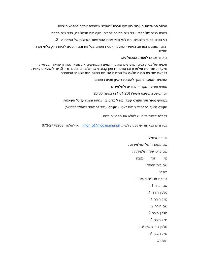 <p dir="RTL" style="text-align:right"><span style="font-size:12pt"><span style="background:white"><span style="direction:rtl"><span style="unicode-bidi:embed"><span style="font-family:"Times New Roman",serif"><span lang="HE" style="font-size:11.0pt"><span style="font-family:"Arial",sans-serif"><span style="color:#202124"></span></span></span></span></span></span></span></span></p><p dir="RTL" style="text-align:right; margin-bottom:11px"><span style="font-size:11pt"><span style="line-height:115%"><span style="direction:rtl"><span style="unicode-bidi:embed"><span style="font-family:Calibri,sans-serif"><span lang="HE" style="background:white"><span style="font-family:"Helvetica",sans-serif"></span></span></span></span></span></span></span></p><p dir="RTL" style="text-align:right; margin-bottom:11px"><span style="font-size:11pt"><span style="line-height:normal"><span style="direction:rtl"><span style="unicode-bidi:embed"><span style="font-family:Calibri,sans-serif"><span lang="HE" style="background:white"><span style="font-family:"Helvetica",sans-serif"></span></span></span></span></span></span></span></p><p dir="RTL" style="text-align:right; margin-bottom:11px"><span style="font-size:11pt"><span style="line-height:normal"><span style="direction:rtl"><span style="unicode-bidi:embed"><span style="font-family:Calibri,sans-serif"><span lang="HE" style="background:white"><span style="font-family:"Helvetica",sans-serif"></span></span></span></span></span></span></span></p><p dir="RTL" style="text-align:right; margin-bottom:11px"><span style="font-size:11pt"><span style="line-height:normal"><span style="direction:rtl"><span style="unicode-bidi:embed"><span style="font-family:Calibri,sans-serif"><span lang="HE" style="background:white"><span style="font-family:"Helvetica",sans-serif"></span></span></span></span></span></span></span></p><p dir="RTL" style="text-align:right; margin-bottom:11px"><span style="font-size:11pt"><span style="line-height:normal"><span style="direction:rtl"><span style="unicode-bidi:embed"><span style="font-family:Calibri,sans-serif"><span lang="HE" style="background:white"><span style="font-family:"Helvetica",sans-serif"></span></span></span></span></span></span></span></p><p dir="RTL" style="text-align:right; margin-bottom:11px"><span style="font-size:11pt"><span style="line-height:normal"><span style="direction:rtl"><span style="unicode-bidi:embed"><span style="font-family:Calibri,sans-serif"><span lang="HE" style="background:white"><span style="font-family:"Helvetica",sans-serif">מרחב המצויינות העירוני בשיתוף חברת "הארה" מזמינים אתכם למפגש חשיפה</span></span></span></span></span></span></span></p><p dir="RTL" style="text-align:right; margin-bottom:11px"><span style="font-size:11pt"><span style="line-height:normal"><span style="direction:rtl"><span style="unicode-bidi:embed"><span style="font-family:Calibri,sans-serif"><span lang="HE" style="background:white"><span style="font-family:"Helvetica",sans-serif">לקורס בנייה של רחפן - כלי טיס מרובה להבים: מקסימום טכנולוגיה, בכלי טיס מרחף. </span></span></span></span></span></span></span></p><p dir="RTL" style="text-align:right; margin-bottom:11px"><span style="font-size:11pt"><span style="line-height:normal"><span style="direction:rtl"><span style="unicode-bidi:embed"><span style="font-family:Calibri,sans-serif"><span lang="HE" style="background:white"><span style="font-family:"Helvetica",sans-serif">כלי הטיס מרובי הלהבים, הם ללא ספק אחת ההמצאות הגדולות של המאה ה-21. </span></span></span></span></span></span></span></p><p dir="RTL" style="text-align:right; margin-bottom:11px"><span style="font-size:11pt"><span style="line-height:normal"><span style="direction:rtl"><span style="unicode-bidi:embed"><span style="font-family:Calibri,sans-serif"><span lang="HE" style="background:white"><span style="font-family:"Helvetica",sans-serif"> כיום, נמצאים במרחב האווירי העולמי, אלפי רחפנים בכל עת והם הופכים להיות חלק בלתי נפרד מחיינו. </span></span></span></span></span></span></span></p><p dir="RTL" style="text-align:right; margin-bottom:11px"><span style="font-size:11pt"><span style="line-height:normal"><span style="direction:rtl"><span style="unicode-bidi:embed"><span style="font-family:Calibri,sans-serif"><span lang="HE" style="background:white"><span style="font-family:"Helvetica",sans-serif">בואו והצטרפו לפסגת הטכנולוגיה: </span></span></span></span></span></span></span></p><p dir="RTL" style="text-align:right; margin-bottom:11px"><span style="font-size:11pt"><span style="line-height:normal"><span style="direction:rtl"><span style="unicode-bidi:embed"><span style="font-family:Calibri,sans-serif"><span lang="HE" style="background:white"><span style="font-family:"Helvetica",sans-serif">תכנית של בניית כלים תעופתיים שונים, ודגמים הממחישים את נושא האווירודינמיקה בעשייה מייקרית חווייתית ומלמדת ובראשם - רחפן קבוצתי שהתלמידים בונים מ – 0, עד להעלאתו לאוויר. כל זאת יחד עם הבנה מלאה של התחום הכי חם בעולם הטכנולוגיה: הרחפנים. </span></span></span></span></span></span></span></p><p dir="RTL" style="text-align:right; margin-bottom:11px"><span style="font-size:11pt"><span style="line-height:normal"><span style="direction:rtl"><span style="unicode-bidi:embed"><span style="font-family:Calibri,sans-serif"><span lang="HE" style="background:white"><span style="font-family:"Helvetica",sans-serif">התכנית תאפשר המשך להוצאת רישיון מטיס רחפנים.</span></span></span></span></span></span></span></p><p dir="RTL" style="text-align:right; margin-bottom:11px"><span style="font-size:11p