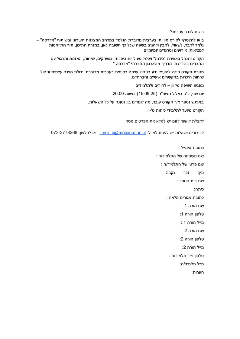 <p dir="RTL" style="text-align:right"><span style="font-size:12pt"><span style="background:white"><span style="direction:rtl"><span style="unicode-bidi:embed"><span style="font-family:"Times New Roman",serif"><span lang="HE" style="font-size:11.0pt"><span style="font-family:"Arial",sans-serif"><span style="color:#202124"></span></span></span></span></span></span></span></span></p><p dir="RTL" style="text-align:right"><span style="font-size:11pt"><span style="line-height:115%"><span style="direction:rtl"><span style="unicode-bidi:embed"><span style="font-family:Calibri,sans-serif"><span lang="HE" style="font-family:"Arial",sans-serif"><span style="color:#202124"></span></span></span></span></span></span></span></p><p dir="RTL" style="text-align:right; margin-bottom:11px"><span style="font-size:11pt"><span style="line-height:normal"><span style="direction:rtl"><span style="unicode-bidi:embed"><span style="font-family:Calibri,sans-serif"><span lang="HE" style="background:white"><span style="font-family:"Helvetica",sans-serif"></span></span></span></span></span></span></span></p><p dir="RTL" style="text-align:right; margin-bottom:11px"><span style="font-size:11pt"><span style="line-height:normal"><span style="direction:rtl"><span style="unicode-bidi:embed"><span style="font-family:Calibri,sans-serif"><span lang="HE" style="background:white"><span style="font-family:"Helvetica",sans-serif">בואו להצטרף לקורס חווייתי בערבית מדוברת הנלמד במרחב המצוינות העירוני ובשיתוף "מדרסה" – נלמד לדבר, לשאול, להבין ולהגיב בשפה שכל כך חשובה כאן, במזרח התיכון, תוך התייחסות למציאות, אירועים וטרנדים יומיומיים</span></span><span dir="LTR" style="background:white"><span style="font-family:"Helvetica",sans-serif">.</span></span><span lang="HE" style="background:white"><span style="font-family:"Helvetica",sans-serif"></span></span></span></span></span></span></span></p><p dir="RTL" style="text-align:right; margin-bottom:11px"><span style="font-size:11pt"><span style="line-height:normal"><span style="direction:rtl"><span style="unicode-bidi:embed"><span style="font-family:Calibri,sans-serif"><span lang="HE" style="background:white"><span style="font-family:"Helvetica",sans-serif">הקורס יתנהל באווירת "סדנה" ויכלול פעילויות כיפיות, משחקים, שיחות, האזנות ותרגול עם החברים בהדרכת מדריך מהארגון החברתי "מדרסה</span></span><span dir="LTR" style="background:white"><span style="font-family:"Helvetica",sans-serif">".</span></span><span lang="HE" style="background:white"><span style="font-family:"Helvetica",sans-serif"></span></span></span></span></span></span></span></p><p dir="RTL" style="text-align:right; margin-bottom:11px"><span style="font-size:11pt"><span style="line-height:normal"><span style="direction:rtl"><span style="unicode-bidi:embed"><span style="font-family:Calibri,sans-serif"><span lang="HE" style="background:white"><span style="font-family:"Helvetica",sans-serif">מטרת הקורס הינה להעניק ידע בניהול שיחה בסיסית בערבית מדוברת, יכולת הצגה עצמית וניהול שיחות היכרות בהקשרים אישיים וחברתיים.</span></span></span></span></span></span></span></p><p dir="RTL" style="text-align:right; margin-bottom:11px"><span style="font-size:11pt"><span style="line-height:normal"><span style="direction:rtl"><span style="unicode-bidi:embed"><span style="font-family:Calibri,sans-serif"><span lang="HE" style="background:white"><span style="font-family:"Helvetica",sans-serif">מפגש חשיפה מקוון – להורים ולתלמידים</span></span></span></span></span></span></span></p><p dir="RTL" style="text-align:right; margin-bottom:11px"><span style="font-size:11pt"><span style="line-height:normal"><span style="direction:rtl"><span style="unicode-bidi:embed"><span style="font-family:Calibri,sans-serif"><span lang="HE" style="background:white"><span style="font-family:"Helvetica",sans-serif">יום שני, כ"ב באלול תשפ"ה (15.09.25) בשעה 20:00</span></span><span dir="LTR" style="background:white"><span style="font-family:"Helvetica",sans-serif">.</span></span><span lang="HE" style="background:white"><span style="font-family:"Helvetica",sans-serif"></span></span></span></span></span></span></span></p><p dir="RTL" style="text-align:right; margin-bottom:11px"><span style="font-size:11pt"><span style="line-height:normal"><span style="direction:rtl"><span style="unicode-bidi:embed"><span style="font-family:Calibri,sans-serif"><span lang="HE" style="background:white"><span style="font-family:"Helvetica",sans-serif">במפגש נספר איך הקורס עובד, מה לומדים בו, ונענה על כל השאלות</span></span><span dir="LTR" style="background:white"><span style="font-family:"Helvetica",sans-serif">.</span></span><span lang="HE" style="background:white"><span style="font-family:"Helvetica",sans-serif"></span></span></span></span></span></span></span></p><p dir="RTL" style="text-align:right; margin-bottom:11px"><span style="font-size:11pt"><span style="line-height:normal"><span style="direction:rtl"><span style="unicode-bidi:embed"><span style="font-family:Calibri,sans-serif"><span lang="HE" style="background:white"><span style="font-family:"Helvetica",sans-serif">הקורס מיועד לתלמידי כיתות ט'-י'.</span></span></span></span></span></span></span></p><p dir="RTL" style="text-align:right"><span style="font-size:12pt"><span style="background:white"><span style="line-height:115%"><span style="direction:rtl"><span style="unicode-bidi:embed"><span style="font-family:"Times New Roman",serif"><span lang="HE" style="font-size:11.0pt"><span style="line-height:115%"><span style="font-family:"Arial",sans-serif"><span style="color:#